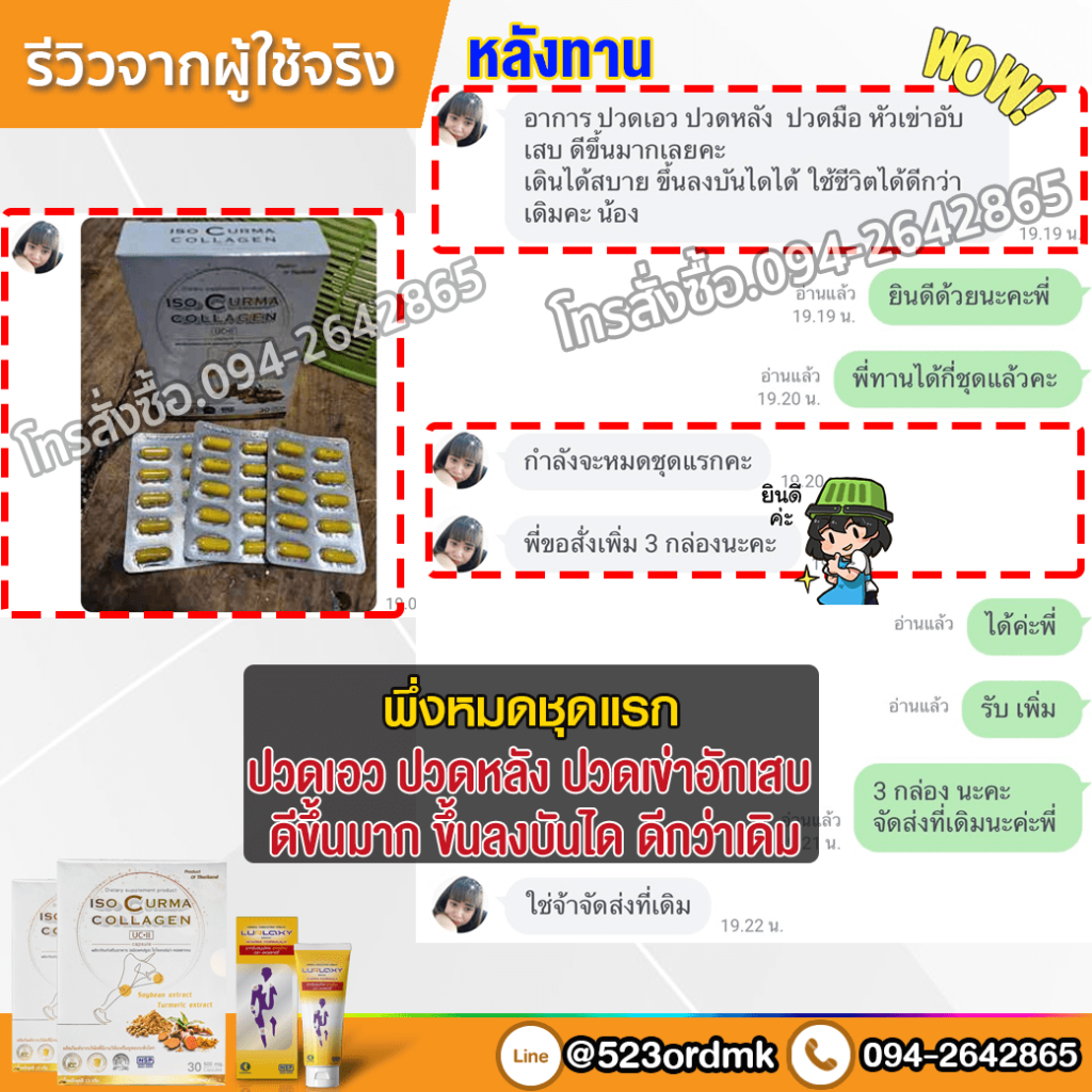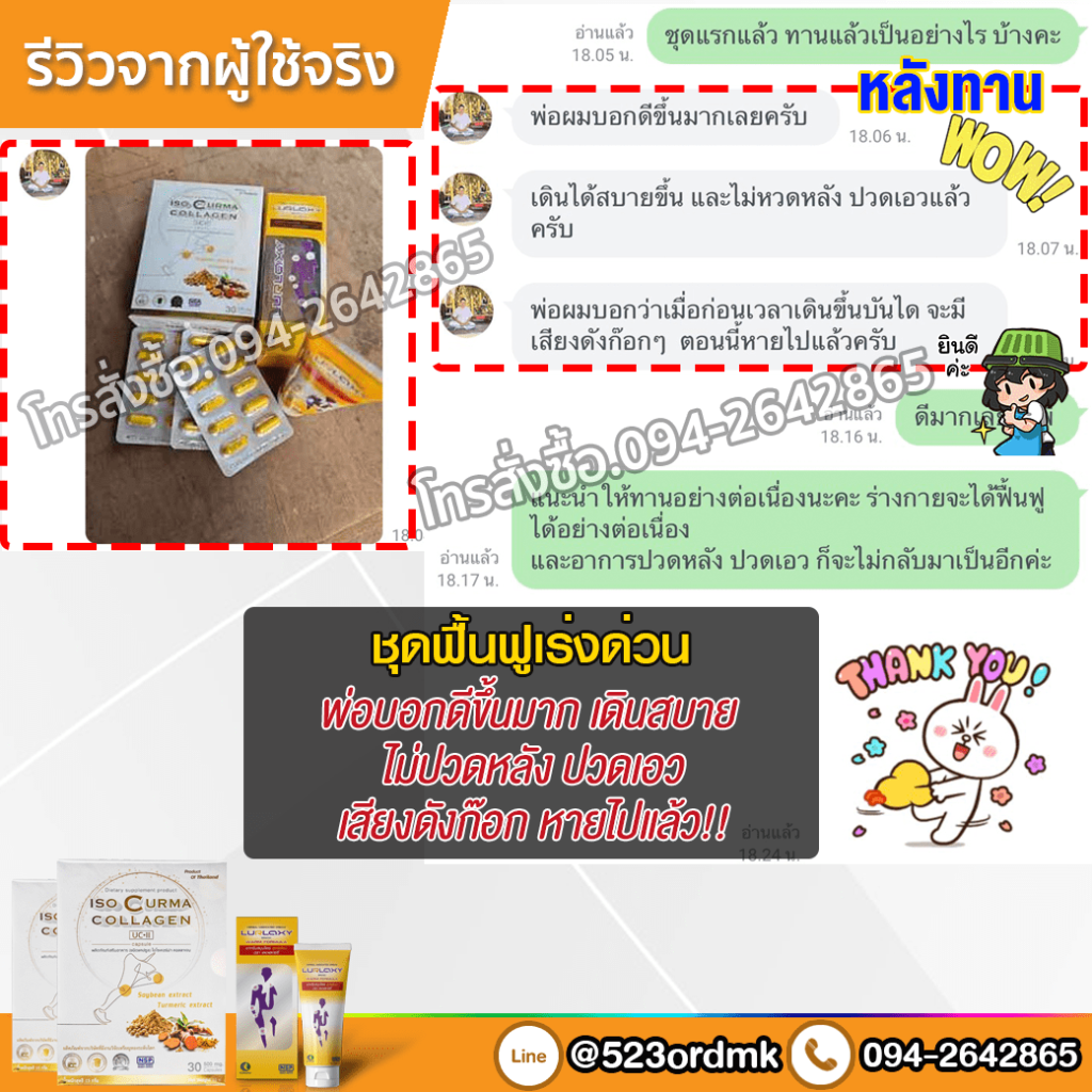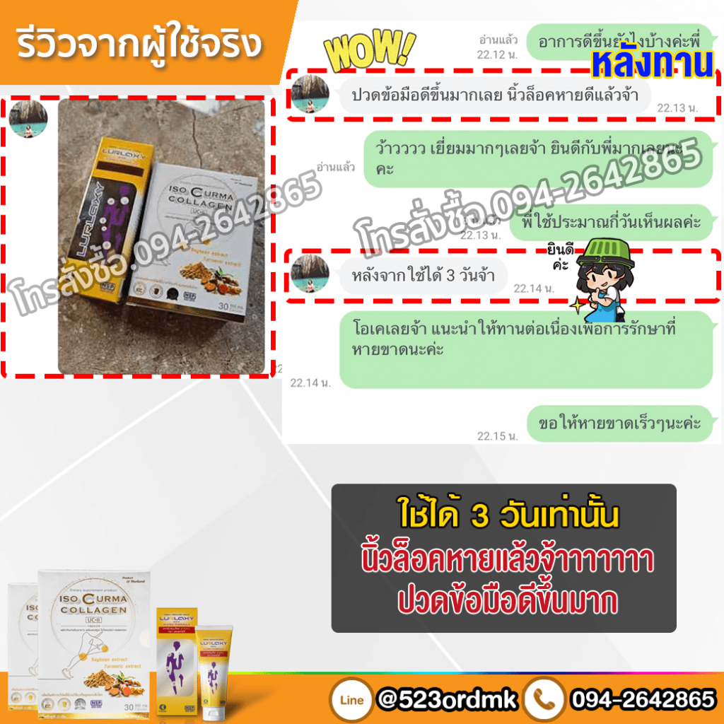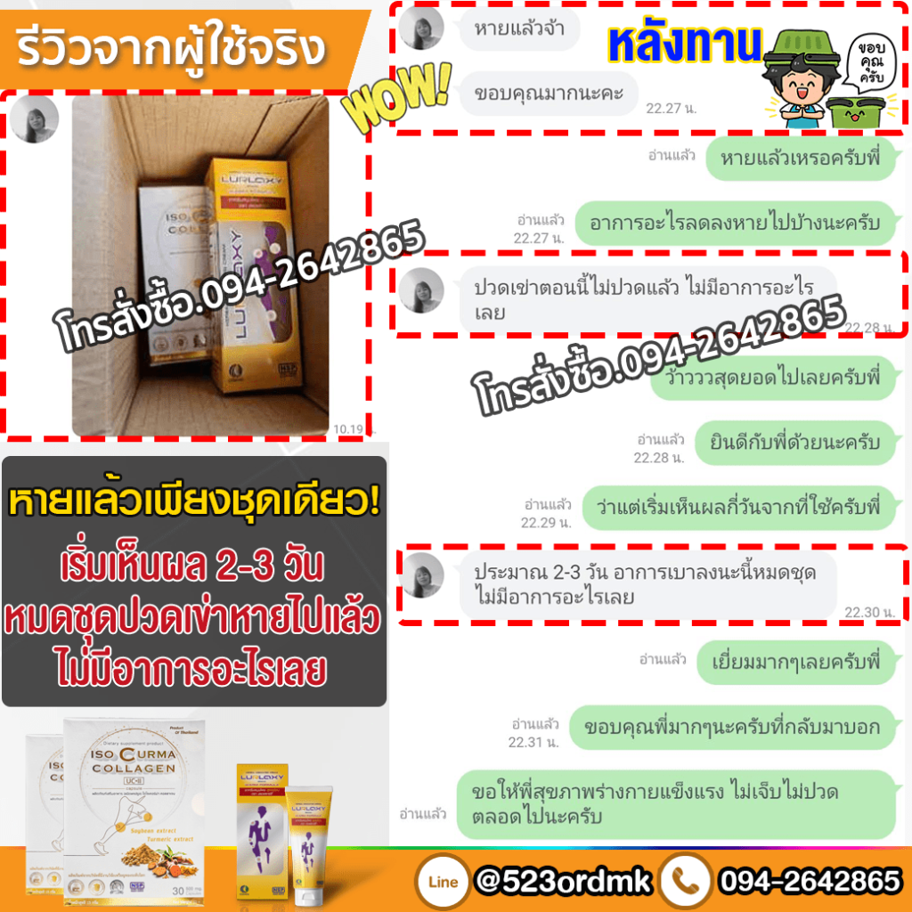 เพราะเหตุนี้เองผมจึง แนะนำผลิตภัณฑ์งานวิจัย ISO CURMA COLLAGEN และ ครีมนวด LURLAXY ของท่าน ดร. ตัวนี้ให้กับเพื่อนๆ และญาติๆที่มีอาการคล้ายๆกับคุณปู่ผม ได้ลองทานกันดู ทุกคนต่างบอกเป็นเสียงเดียวกันว่า อาการดีขึ้น เห็นผลจริง