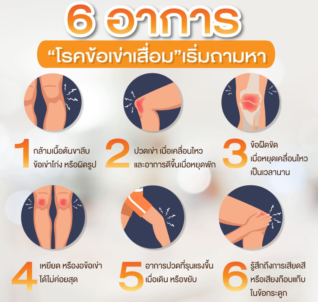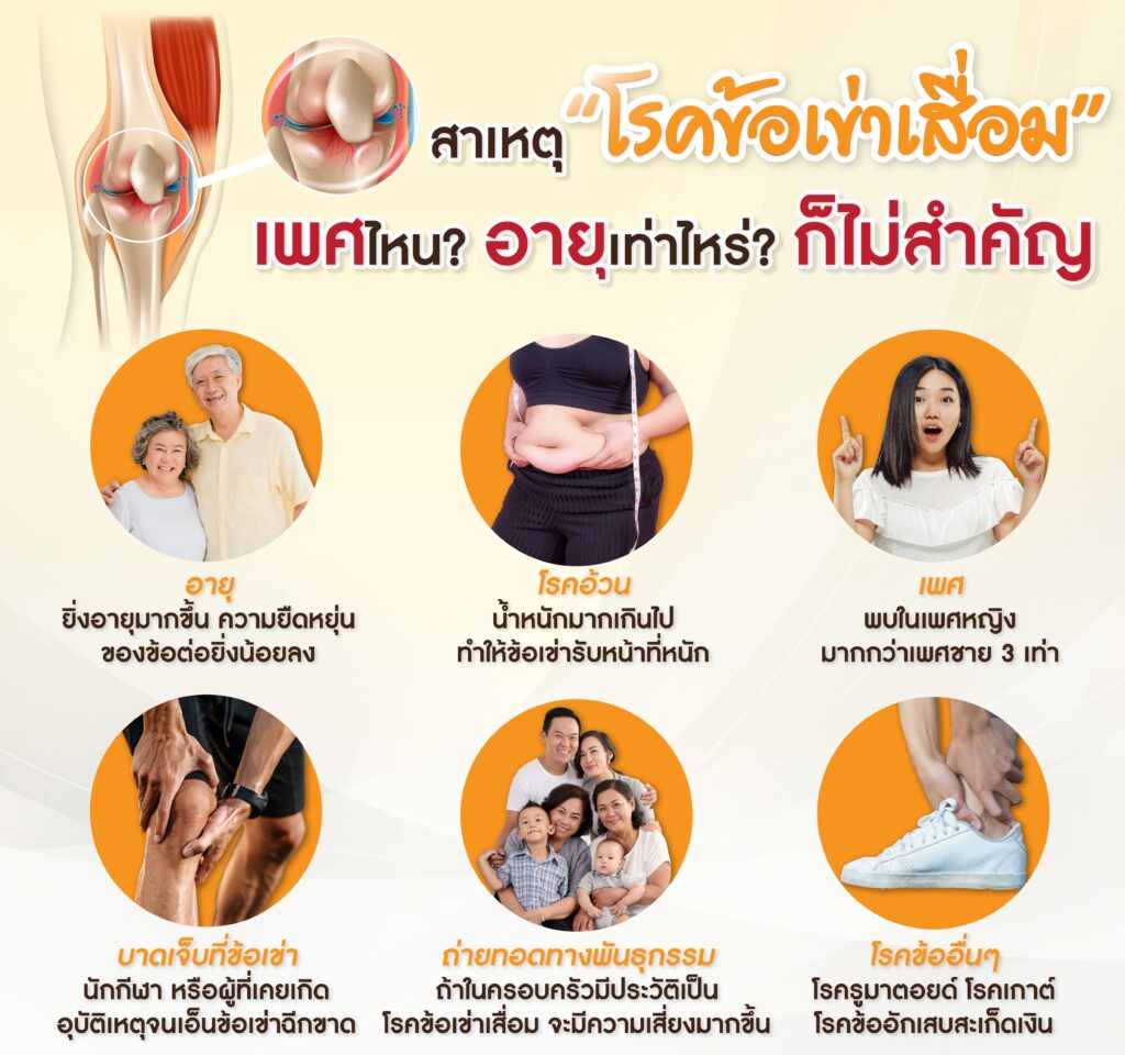 สาเหตุหลักของอาการกระดูกและข้อเสื่อม เกิดจากการที่เราใช้งานร่างกายหนักมากเกินไป ไม่ว่าจะเกิดจากการทำงาน เกิดจากการออกกำลังกายหนักๆ อาการเริ่มต้นของกระดูกและข้อเสื่อม ส่วนมากจะเกิดจากการมีเสียงดังก๊อกๆแก๊บๆ หรือว่ามีอาการบวมเกิดขึ้น เดิน ลุกนั้ง จะไม่ค่อยได้ การทำงานของข้อและกระดูกจะเริ่มถดถอยลดลงเรื่อยๆ เพื่อให้เห็นภาพให้ทุกท่านจิตนาการถึงกระดูกอ่อน เปรียบเหมือนดอกยางรถ พอใช้ไปเรื่อยๆดอกยางจะเริ่มสึกหรอหมดลงเรื่อยๆ เหมือนกับกระดูกอ่อนใช้งานไปเรื่อยๆกระดูกอ่อนจะเริ่มบางลง เริ่มสึกหรอลงเรื่อยๆ เพราะเซลล์ถูกทำลาย พอเซลล์ถูกทำลายไปเรื่อยๆจึงไปกระตุ้นให้เยื่อหุ้มข้อ สร้างสารน้ำออกมา พอสารน้ำออกมาจึงทำให้เกิดสภาวะเข่าบวม จึงทำให้เกิดสภาวะอาการปวดกระดูก และ ข้อ ดังภาพที่ทุกท่านเห็นข้างล่างนี้ครับ